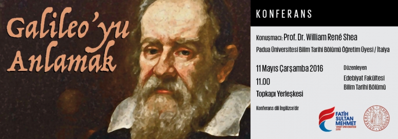 Üniversitemiz Edebiyat Fakültesi Bilim Tarihi Bölümü tarafından düzenlenen "Galileo'yu Anlamak Konferansı" 11 Mayıs 2016 Çarşamba günü saat 11:00'de Topkapı Yerleşkesi konferans salonunda, Padua Üniversitesi Bilim Tarihi Bölümü Öğretim Üyesi Prof. Dr. William Renê Shea tarafından verilecektir. Konferansa tüm akademik ve idari personel ile öğrencilerimiz davetlidir.