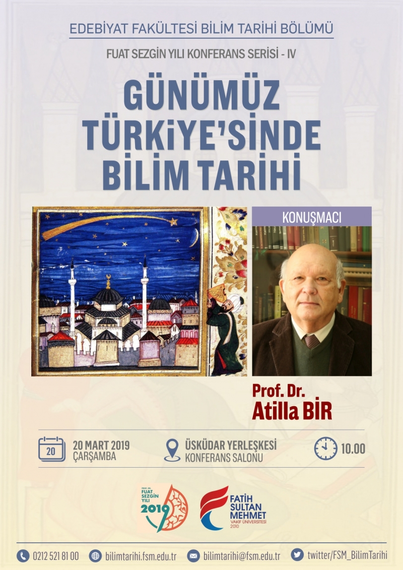 2019 Prof. Dr. Fuat Sezgin Yılı kapsamında düzenlenen konferans serisinin dördüncüsünde Günümüz Türkiye'sinde Bilim Tarihi konusu ele alınacaktır. Bilim Tarihi öğretim üyesi Prof. Dr. Atilla BİR’in konuşmacı olduğu konferans, 20 Mart’ta Üsküdar Yerleşkesi’nde düzenlenecek.