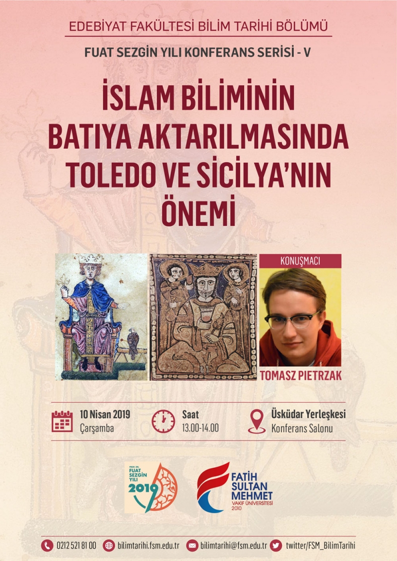 2019 Prof. Dr. Fuat Sezgin Yılı kapsamında düzenlenen konferans serisinin beşincisinde İslam Biliminin Batıya Aktarılmasında Toledo ve Sicilya’nın Önemi konusu ele alınacaktır. Bilim Tarihi öğretim elemanı Öğr. Gör. Tomasz Pietrzak’ın konuşmacı olduğu konferans, 10 Nisan’da Üsküdar Yerleşkesi’nde düzenlenecektir.