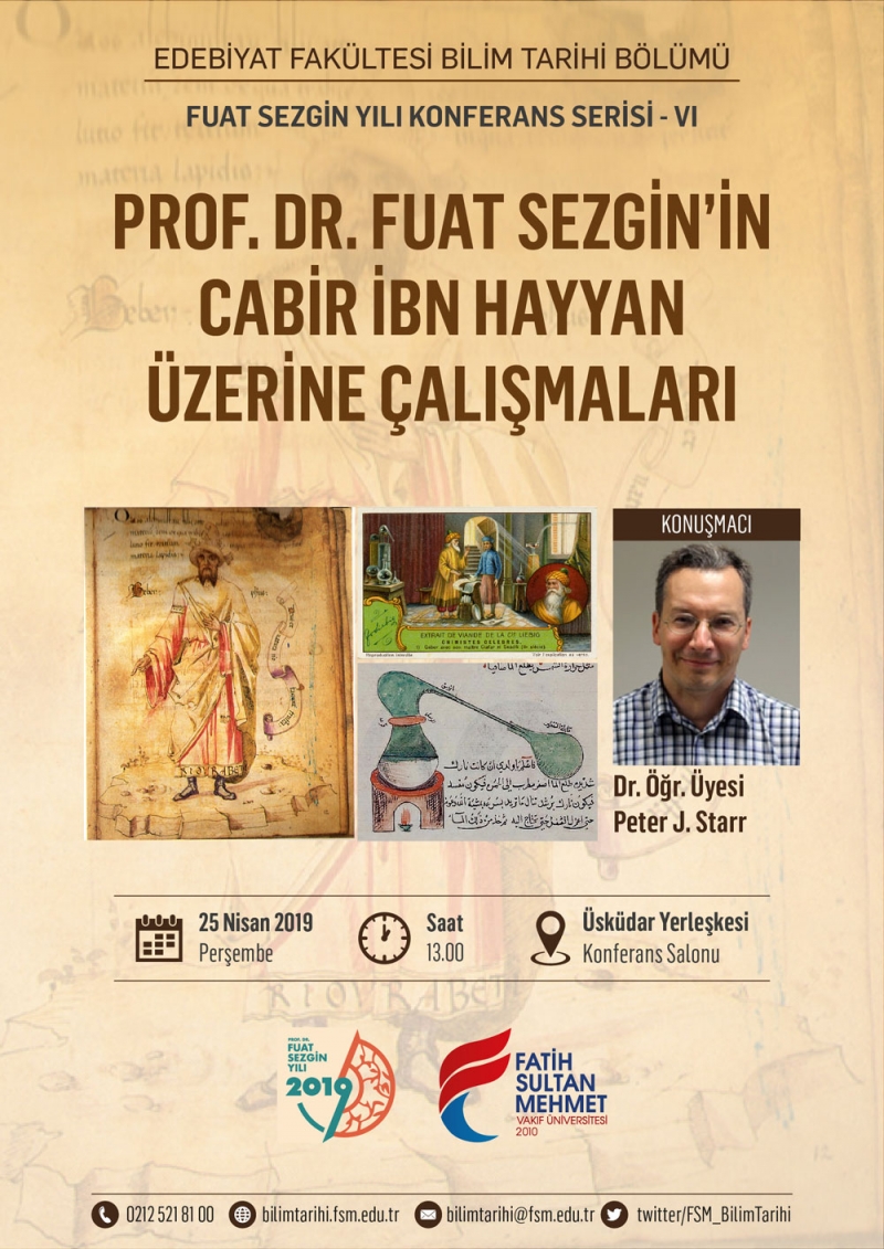 “2019 Prof. Dr. Fuat Sezgin Yılı” kapsamında düzenlenen konferans serisinin altıncısında, Bilim Tarihi Bölümü öğretim görevlisi Dr. Öğr. Üyesi Peter J. Starr, “Prof. Dr. Fuat Sezgin'in Cabir İbn Hayyan Üzerine Çalışmaları” başlığında konuşacak.