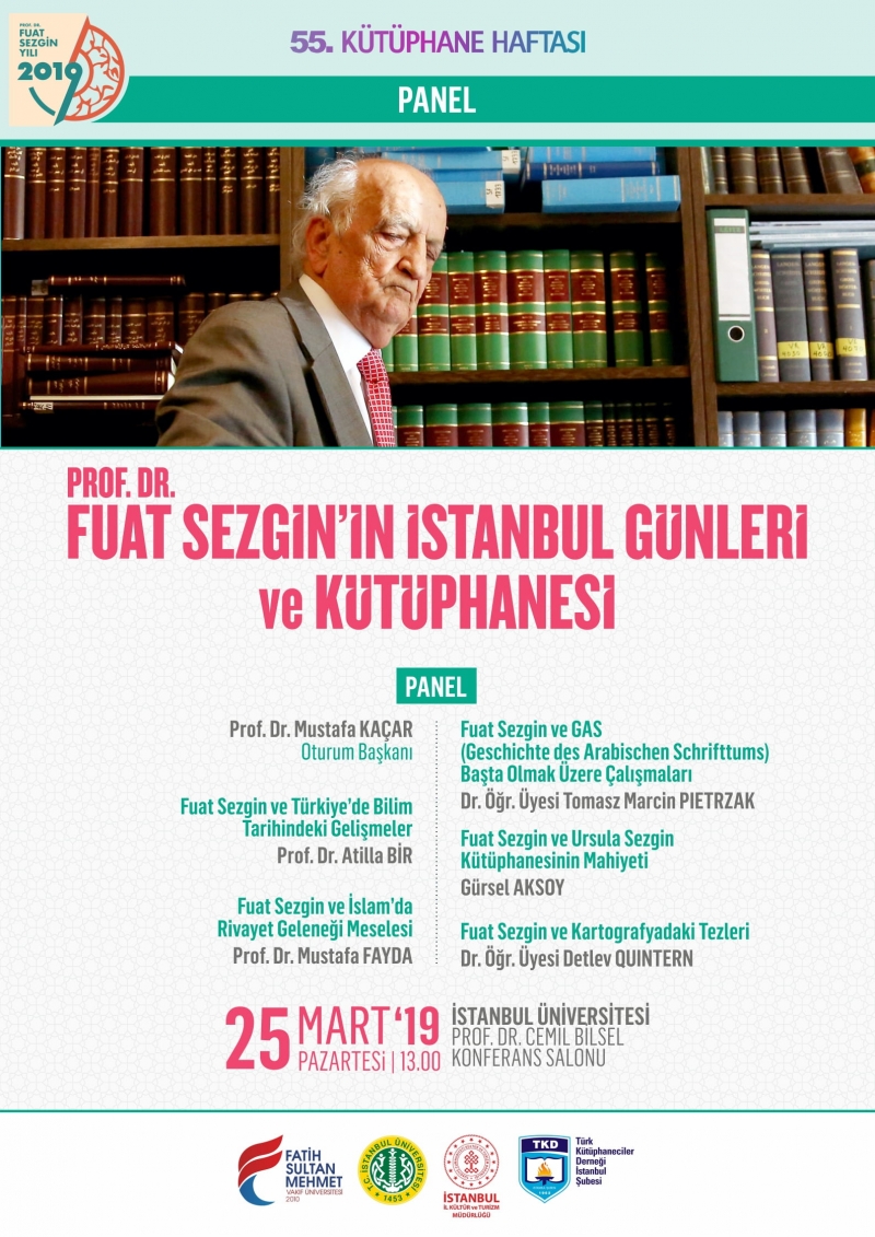 2019 Prof. Dr. Fuat Sezgin Yılı kapsamında düzenlenen panalde Prof. Dr. Fuat Sezgin'in İstanbul Günleri ve Kütüphanesi konuşulacaktır. Bilim Tarihi öğretim üyelerinin konuşmacı olduğu panel, 25 Mart’ta İstanbul Üniversitesi’nde düzenlenecek.